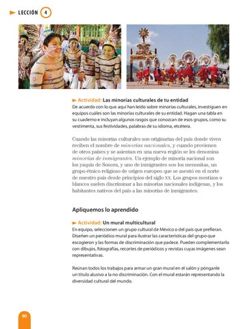 Apliquemos lo aprendido Actividad: Un mural multicultural En equipo, seleccionen un grupo cultural de México o del país que prefieran. Diseñen un periódico mural para ilustrar las características del grupo que escogieron y las formas de discriminación que padece. Pueden complementarlo con dibujos, fotografías, recortes de periódicos y revistas cuyas imágenes sean representativas. Reúnan todos los trabajos para armar un gran mural en el salón y pónganle un título alusivo a la no discriminación. Con el mural estarán representando la diversidad cultural del mundo.