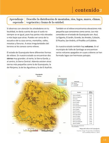 También en el relieve encontramos elevaciones más pequeñas que conocemos como cerros. Los más conocidos en el estado de Guanajuato son: Azul, La Giganta, El Jardín, Grande, los Amoles, Culiacán, El Picacho, San Andrés, el Pinalillo y el Cubilete. En nuestro estado también hay volcanes. En el municipio de Valle de Santiago se encuentran varios volcanes apagados en cuyos cráteres se han formado lagos con hermosos paisajes.