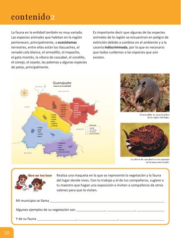 Realiza una maqueta en la que se represente la vegetación y la fauna del lugar donde vives. Con tu trabajo y el de tus compañeros, sugiere a tu maestro que hagan una exposición e inviten a compañeros de otros salones para que la visiten. Mi municipio se llama Algunos ejemplos de su vegetación son Y de su fauna