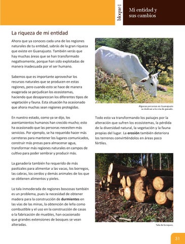 La riqueza de mi entidad Ahora que ya conoces cada una de las regiones naturales de tu entidad, sabrás de la gran riqueza que existe en Guanajuato. También verás que hay muchas áreas que se han transformado negativamente, porque han sido explotadas de manera inadecuada por el ser humano. Sabemos que es importante aprovechar los recursos naturales que se producen en estas regiones, pero cuando esto se hace de manera exagerada se perjudican los ecosistemas, haciendo que desaparezcan los diferentes tipos de vegetación y fauna. Esta situación ha ocasionado que ahora muchas sean regiones protegidas. En nuestro estado, como ya se dijo, los asentamientos humanos han crecido mucho; esto ha ocasionado que las personas necesiten más servicios. Por ejemplo, se ha requerido hacer más carreteras para mantener los lugares comunicados, construir más presas para almacenar agua, transformar más regiones naturales en campos de cultivo para poder sembrar y producir más.
