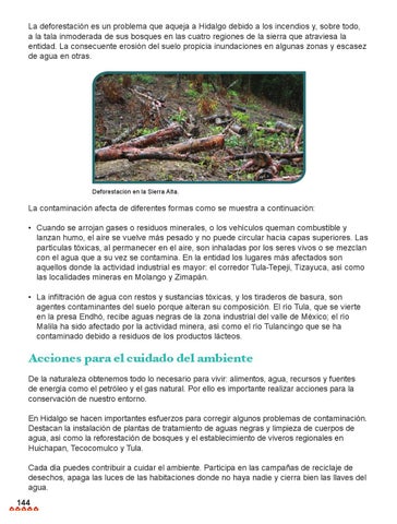 Acciones para el cuidado del ambiente De la naturaleza obtenemos todo lo necesario para vivir: alimentos, agua, recursos y fuentes de energía como el petróleo y el gas natural. Por ello es importante realizar acciones para la conservación de nuestro entorno. En Hidalgo se hacen importantes esfuerzos para corregir algunos problemas de contaminación. Destacan la instalación de plantas de tratamiento de aguas negras y limpieza de cuerpos de agua, así como la reforestación de bosques y el establecimiento de viveros regionales en Huichapan, Tecocomulco y Tula. Cada día puedes contribuir a cuidar el ambiente. Participa en las campañas de reciclaje de desechos, apaga las luces de las habitaciones donde no haya nadie y cierra bien las llaves del agua. 144