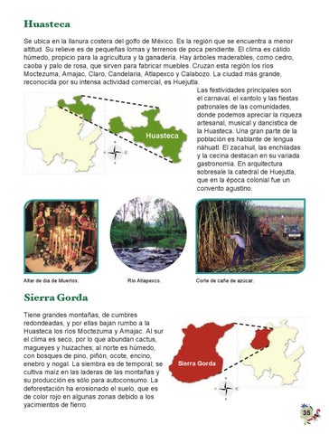 Huasteca Se ubica en la llanura costera del golfo de México. Es la región que se encuentra a menor altitud. Su relieve es de pequeñas lomas y terrenos de poca pendiente. El clima es cálido húmedo, propicio para la agricultura y la ganadería. Hay árboles maderables, como cedro, caoba y palo de rosa, que sirven para fabricar muebles. Cruzan esta región los ríos Moctezuma, Amajac, Claro, Candelaria, Atlapexco y Calabozo. La ciudad más grande, reconocida por su intensa actividad comercial, es Huejutla. Las festividades principales son el carnaval, el xantolo y las fiestas patronales de las comunidades, donde podemos apreciar la riqueza artesanal, musical y dancística de la Huasteca. Una gran parte de la Huasteca población es hablante de lengua N náhuatl. El zacahuil, las enchiladas O E y la cecina destacan en su variada S gastronomía. En arquitectura sobresale la catedral de Huejutla, que en la época colonial fue un convento agustino.