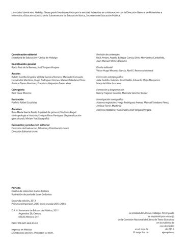 La entidad donde vivo. Hidalgo. Tercer grado se imprimió por encargo de la Comisión Nacional de Libros de Texto Gratuitos, en los talleres de con domicilio en el mes de de 2013. El tiraje fue de ejemplares.