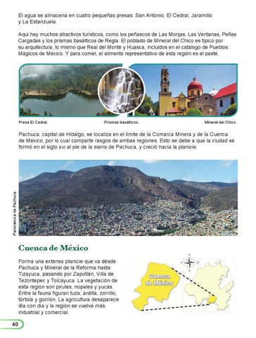 Cuenca de México Forma una extensa planicie que va desde Pachuca y Mineral de la Reforma hasta Tizayuca, pasando por Zapotlán, Villa de Tezontepec y Tolcayuca. La vegetación de esta región son pirules, nopales y yucas. Entre la fauna figuran tuza, ardilla, zorrillo, tórtola y gorrión. La agricultura desaparece día con día y la región se vuelve más industrial y comercial.