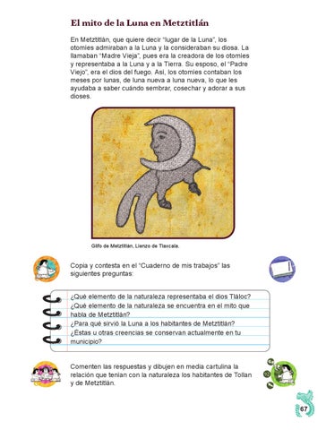 Copia y contesta en el “Cuaderno de mis trabajos” las siguientes preguntas: ¿Qué elemento de la naturaleza representaba el dios Tláloc? ¿Qué elemento de la naturaleza se encuentra en el mito que habla de Metztitlán? ¿Para qué sirvió la Luna a los habitantes de Metztitlán? ¿Éstas u otras creencias se conservan actualmente en tu municipio? Comenten las respuestas y dibujen en media cartulina la relación que tenían con la naturaleza los habitantes de Tollan y de Metztitlán.