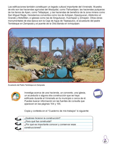 Investiga acerca de una hacienda, un convento, una iglesia, un acueducto o alguna otra construcción que se haya edificado durante el Virreinato en tu municipio o cerca de él. Puedes buscar información en las fuentes de consulta que aparecen en las páginas 154 y 155. Copia y contesta en el “Cuaderno de mis trabajos” lo siguiente: ¿Quiénes hicieron la construcción? ¿Para qué fue construida? ¿Por qué es importante conocer y conservar esas construcciones?