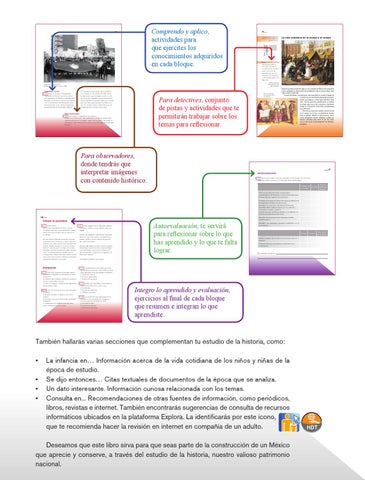 También hallarás varias secciones que complementan tu estudio de la historia, como: • La infancia en… Información acerca de la vida cotidiana de los niños y niñas de la época de estudio. • Se dijo entonces… Citas textuales de documentos de la época que se analiza. • Un dato interesante. Información curiosa relacionada con los temas. • Consulta en... Recomendaciones de otras fuentes de información, como periódicos, libros, revistas e internet. También encontrarás sugerencias de consulta de recursos informáticos ubicados en la plataforma Explora. La identificarás por este icono, que te recomienda hacer la revisión en internet en compañía de un adulto. Deseamos que este libro sirva para que seas parte de la construcción de un México que aprecie y conserve, a través del estudio de la historia, nuestro valioso patrimonio nacional.