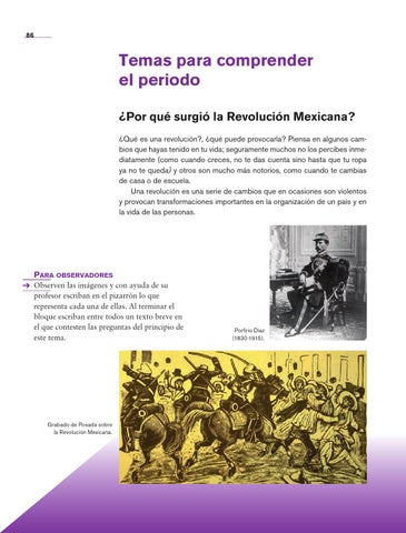 Temas para comprender el periodo ¿Por qué surgió la Revolución Mexicana? ¿Qué es una revolución?, ¿qué puede provocarla? Piensa en algunos cambios que hayas tenido en tu vida; seguramente muchos no los percibes inmediatamente (como cuando creces, no te das cuenta sino hasta que tu ropa ya no te queda) y otros son mucho más notorios, como cuando te cambias de casa o de escuela. Una revolución es una serie de cambios que en ocasiones son violentos y provocan transformaciones importantes en la organización de un país y en la vida de las personas.