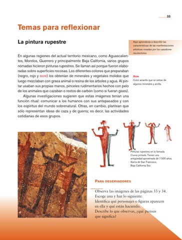para observadores Observa las imágenes de las páginas 33 y 34. Escoge una y haz lo siguiente: Identifica qué personajes o figuras aparecen en ella y qué están haciendo. Describe lo que observas, ¿qué piensas que significa?