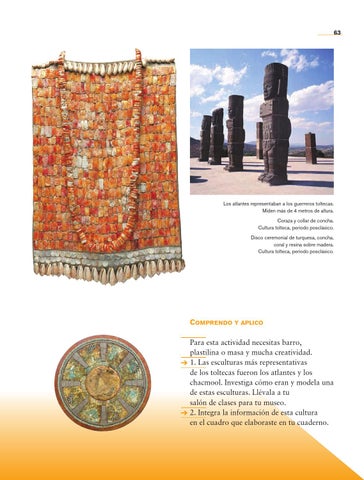 Comprendo y apliCo Para esta actividad necesitas barro, plastilina o masa y mucha creatividad. 1. Las esculturas más representativas de los toltecas fueron los atlantes y los chacmool. Investiga cómo eran y modela una de estas esculturas. Llévala a tu salón de clases para tu museo. 2. Integra la información de esta cultura en el cuadro que elaboraste en tu cuaderno.