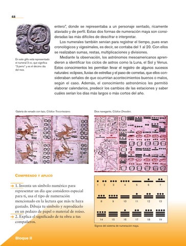 entero”, donde se representaba a un personaje sentado, ricamente ataviado y de perfil. Estas dos formas de numeración maya son consideradas las más difíciles de descifrar e interpretar. Los numerales también servían para registrar el tiempo, pues eran cronológicos y vigesimales, es decir, se contaba del 1 al 20. Con ellos se realizaban sumas, restas, multiplicaciones y divisiones. Mediante la observación, los astrónomos mesoamericanos aprendieron a identificar los ciclos de astros como la Luna, el Sol y Venus. Estos conocimientos les permitían llevar el registro de algunos sucesos naturales: eclipses, lluvias de estrellas y el paso de cometas, que ellos consideraban señales de que ocurrirían acontecimientos buenos o malos, según el caso. Además, el conocimiento astronómico les permitió elaborar calendarios, predecir los cambios de las estaciones y saber cuáles serían los días más largos o más cortos del año.