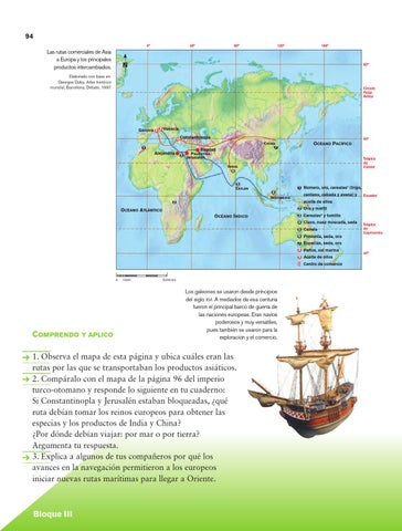 1. Observa el mapa de esta página y ubica cuáles eran las rutas por las que se transportaban los productos asiáticos. 2. Compáralo con el mapa de la página 96 del imperio turco-otomano y responde lo siguiente en tu cuaderno: Si Constantinopla y Jerusalén estaban bloqueadas, ¿qué ruta debían tomar los reinos europeos para obtener las especias y los productos de India y China? ¿Por dónde debían viajar: por mar o por tierra? Argumenta tu respuesta. 3. Explica a algunos de tus compañeros por qué los avances en la navegación permitieron a los europeos iniciar nuevas rutas marítimas para llegar a Oriente.
