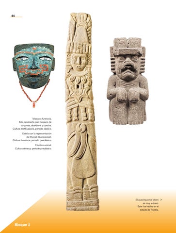 Máscara funeraria. Está recubierta con mosaico de turquesa, obsidiana y concha. Cultura teotihuacana, periodo clásico. Estela con la representación de Ehécatl-Quetzalcóatl. Cultura huasteca, periodo posclásico. Hombre-animal. Cultura olmeca, periodo preclásico.