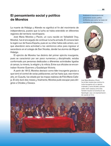 El pensamiento social y político de Morelos La muerte de Hidalgo y Allende no significó el fin del movimiento de independencia, puesto que la lucha se había extendido en diferentes regiones del territorio novohispano. José María Morelos y Pavón, un cura nacido en Valladolid (hoy, Morelia), fue el encargado de continuar la lucha armada. Él conocía bien la región sur de Nueva España, pues en su niñez había sido arriero, aunque abandonó esta actividad a los veinticinco años para ingresar al sacerdocio en el colegio de San Nicolás, donde fue alumno de Miguel Hidalgo. El ejército de Morelos fue distinto del primer ejército insurgente, pues se caracterizó por ser poco numeroso y disciplinado; estaba conformado por personas dedicadas a diferentes actividades ligadas al campo, la minería, la religión y la milicia. Entre sus oficiales se encontraban Vicente Guerrero y Guadalupe Victoria. A partir de 1812, Morelos destacó como líder insurgente gracias a que tomó el control de varias poblaciones; así fue hasta que, ese mismo año, en Cuautla, fue sitiado por las tropas realistas de Félix María Calleja. El sitio duró dos meses y, finalmente, Morelos pudo escapar para dirigirse a Orizaba y Oaxaca.