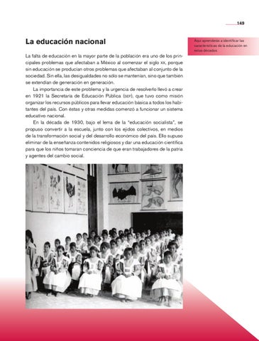 La falta de educación en la mayor parte de la población era uno de los principales problemas que afectaban a México al comenzar el siglo xx, porque sin educación se producían otros problemas que afectaban al conjunto de la sociedad. Sin ella, las desigualdades no sólo se mantenían, sino que también se extendían de generación en generación. La importancia de este problema y la urgencia de resolverlo llevó a crear en 1921 la Secretaría de Educación Pública (sep), que tuvo como misión organizar los recursos públicos para llevar educación básica a todos los habitantes del país. Con éstas y otras medidas comenzó a funcionar un sistema educativo nacional. En la década de 1930, bajo el lema de la “educación socialista”, se propuso convertir a la escuela, junto con los ejidos colectivos, en medios de la transformación social y del desarrollo económico del país. Ello supuso eliminar de la enseñanza contenidos religiosos y dar una educación científica para que los niños tomaran conciencia de que eran trabajadores de la patria y agentes del cambio social.