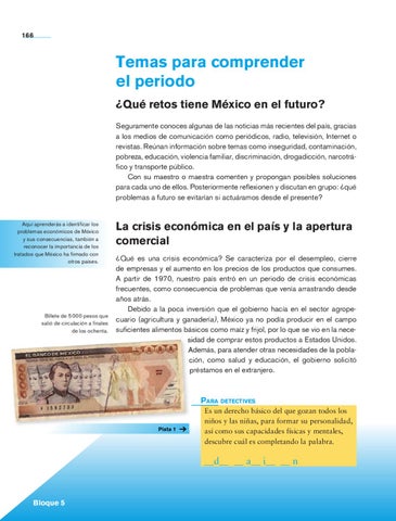 Temas para comprender el periodo ¿Qué retos tiene México en el futuro? Seguramente conoces algunas de las noticias más recientes del país, gracias a los medios de comunicación como periódicos, radio, televisión, Internet o revistas. Reúnan información sobre temas como inseguridad, contaminación, pobreza, educación, violencia familiar, discriminación, drogadicción, narcotráfico y transporte público. Con su maestro o maestra comenten y propongan posibles soluciones para cada uno de ellos. Posteriormente reflexionen y discutan en grupo: ¿qué problemas a futuro se evitarían si actuáramos desde el presente?