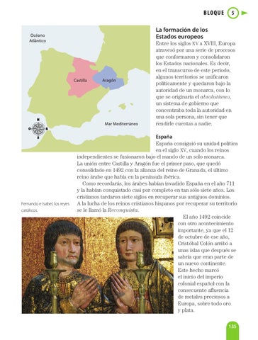 España España consiguió su unidad política en el siglo XV, cuando los reinos independientes se fusionaron bajo el mando de un solo monarca. La unión entre Castilla y Aragón fue el primer paso, que quedó consolidado en 1492 con la alianza del reino de Granada, el último reino árabe que había en la península ibérica. Como recordarás, los árabes habían invadido España en el año 711 y la habían conquistado casi por completo en tan sólo siete años. Los cristianos tardaron siete siglos en recuperar sus antiguos dominios. A la lucha de los reinos cristianos hispanos por recuperar su territorio se le llamó la Reconquista. El año 1492 coincide con otro acontecimiento importante, ya que el 12 de octubre de ese año, Cristóbal Colón arribó a unas islas que después se sabría que eran parte de un nuevo continente. Este hecho marcó el inicio del imperio colonial español con la consecuente afluencia de metales preciosos a Europa, sobre todo oro y plata. 135