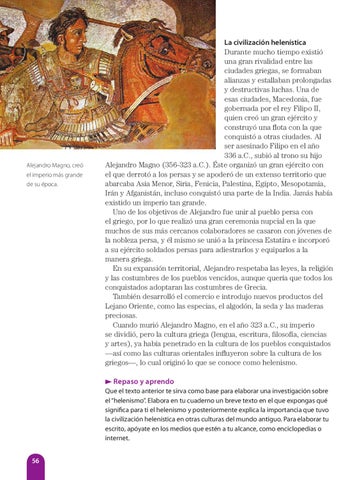 La civilización helenística Durante mucho tiempo existió una gran rivalidad entre las ciudades griegas, se formaban alianzas y estallaban prolongadas y destructivas luchas. Una de esas ciudades, Macedonia, fue gobernada por el rey Filipo II, quien creó un gran ejército y construyó una flota con la que conquistó a otras ciudades. Al ser asesinado Filipo en el año 336 a.C., subió al trono su hijo Alejandro Magno (356-323 a.C.). Éste organizó un gran ejército con el que derrotó a los persas y se apoderó de un extenso territorio que abarcaba Asia Menor, Siria, Fenicia, Palestina, Egipto, Mesopotamia, Irán y Afganistán, incluso conquistó una parte de la India. Jamás había existido un imperio tan grande. Uno de los objetivos de Alejandro fue unir al pueblo persa con el griego, por lo que realizó una gran ceremonia nupcial en la que muchos de sus más cercanos colaboradores se casaron con jóvenes de la nobleza persa, y él mismo se unió a la princesa Estatira e incorporó a su ejército soldados persas para adiestrarlos y equiparlos a la manera griega. En su expansión territorial, Alejandro respetaba las leyes, la religión y las costumbres de los pueblos vencidos, aunque quería que todos los conquistados adoptaran las costumbres de Grecia. También desarrolló el comercio e introdujo nuevos productos del Lejano Oriente, como las especias, el algodón, la seda y las maderas preciosas. Cuando murió Alejandro Magno, en el año 323 a.C., su imperio se dividió, pero la cultura griega (lengua, escritura, filosofía, ciencias y artes), ya había penetrado en la cultura de los pueblos conquistados —así como las culturas orientales influyeron sobre la cultura de los griegos—, lo cual originó lo que se conoce como helenismo. Repaso y aprendo Que el texto anterior te sirva como base para elaborar una investigación sobre el “helenismo”. Elabora en tu cuaderno un breve texto en el que expongas qué significa para ti el helenismo y posteriormente explica la importancia que tuvo la civilización helenística en otras culturas del mundo antiguo. Para elaborar tu escrito, apóyate en los medios que estén a tu alcance, como enciclopedias o internet.