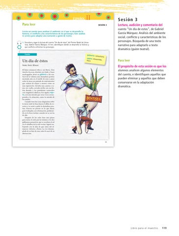 Leerás un cuento para analizar el ambiente en el que se desarrolla la historia, el conflicto y las características de los personajes. Este análisis te servirá para adaptar una narración a guión de teatro. 1. Escuchen y sigan la lectura del cuento “Un día de éstos”, del Premio Nobel de Literatura, Gabriel García Márquez. Al leer, identifiquen dónde se desarrolla la historia y qué conflicto enfrentan los personajes.