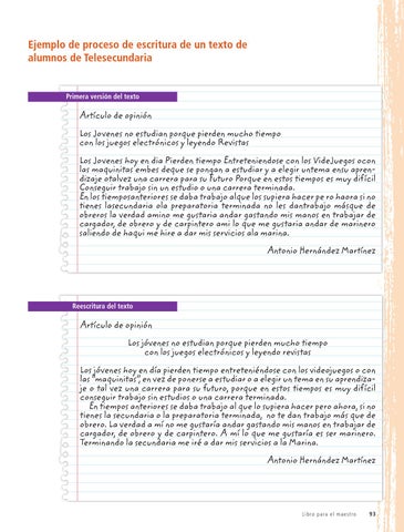 Artículo de opinión Los Jovenes no estudian porque pierden mucho tiempo con los juegos electrónicos y leyendo Revistas Los Jovenes hoy en dia Pierden tiempo Entreteniendose con los VideJuegos ocon las maquinitas embes deque se pongan a estudiar y a elegir untema ensu aprendizaje otalvez una carrera para su Futuro Porque en estos tiempos es muy difícil Conseguir trabajo sin un estudio o una carrera terminada. En los tiemposanteriores se daba trabajo alque los supiera hacer pe ro haora si no tienes lasecundaria ola preparatoria terminada no les dantrabajo másque de obreros la verdad amino me gustaria andar gastando mis manos en trabajar de cargador, de obrero y de carpintero ami lo que me gustaria andar de marinero saliendo de haqui me hire a dar mis servicios ala marina. Antonio Hernández Martínez