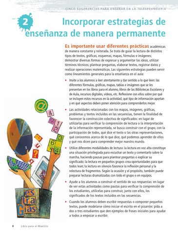 Incorporar estrategias de 2 enseñanza de manera permanente Es importante usar diferentes prácticas académicas de manera constante y reiterada. Se trata de guiar la lectura de distintos tipos de textos, gráficas, esquemas, mapas, fórmulas e imágenes; demostrar diversas formas de expresar y argumentar las ideas, utilizar términos técnicos; plantear preguntas, elaborar textos, registrar datos y realizar operaciones matemáticas. Las siguientes estrategias pueden servir como lineamientos generales para la enseñanza en el aula: • Invite a los alumnos a leer atentamente y dar sentido a lo que leen: las diferentes fórmulas, gráficas, mapas, tablas e imágenes que se les presentan en los libros para el alumno, libros de las Bibliotecas Escolares y de Aula, recursos digitales, videos, etc. Reflexione con ellos sobre por qué se incluyen estos recursos en la actividad, qué tipo de información aportan y en qué aspectos deben poner atención para comprenderlos mejor. • Las actividades relacionadas con los mapas, imágenes, gráficas, problemas y textos incluidos en las secuencias, tienen la finalidad de favorecer la construcción colectiva de significados: en lugar de utilizarlas para verificar la comprensión de lectura o la interpretación de la información representada, se busca construir con el grupo, con la participación de todos, qué dice el texto o las otras representaciones, qué conocemos acerca de lo que dice, qué podemos aprender de ellos y qué nos dicen para comprender mejor nuestro mundo. • Utilice diferentes modalidades de lectura: la lectura en voz alta constituye una situación privilegiada para escuchar un texto y comentarlo sobre la marcha, haciendo pausas para plantear preguntas o explicar su significado; la lectura en pequeños grupos crea oportunidades para que todos lean; la lectura en silencio favorece la reflexión personal y la relectura de fragmentos. Según la ocasión y el propósito, también puede preparar lecturas dramatizadas con todo el grupo o en equipos. • Ayude a los alumnos a construir el sentido de sus respuestas: en lugar de ver estas actividades como pautas para verificar la comprensión de los estudiantes, utilícelas para construir, junto con ellos, los significados de los textos incluidos en las secuencias. • Cuando los alumnos deben escribir respuestas o componer pequeños textos, puede modelarse cómo iniciar el escrito en el pizarrón: pida a dos o tres estudiantes que den ejemplos de frases iniciales para ayudar a todos a empezar a escribir.