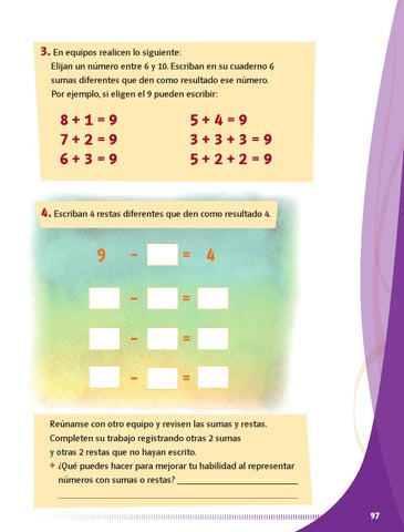 Reúnanse con otro equipo y revisen las sumas y restas. Completen su trabajo registrando otras 2 sumas y otras 2 restas que no hayan escrito. ❖ ¿Qué puedes hacer para mejorar tu habilidad al representar números con sumas o restas? 97 AB-MATE-1-P-076-113.indd 97