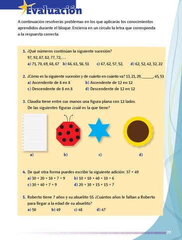 4. De qué otra forma puedes escribir la siguiente adición: 37 + 49 a) 30 + 20 + 10 + 7 + 9 b) 10 + 10 + 40 + 10 + 6 c ) 30 + 40 + 7 + 9 d) 20 + 30 + 15 + 15 + 7 5. Roberto tiene 7 años y su abuelito 55. ¿Cuántos años le faltan a Roberto para llegar a la edad de su abuelito? a) 50 b) 49 c) 48 d) 47