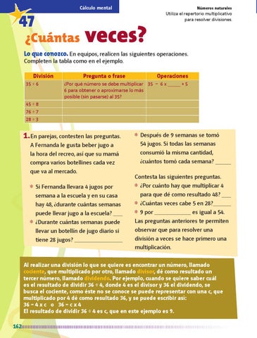 Al realizar una división lo que se quiere es encontrar un número, llamado cociente, que multiplicado por otro, llamado divisor, dé como resultado un tercer número, llamado dividendo. Por ejemplo, cuando se quiere saber cuál es el resultado de dividir 36 ÷ 4, donde 4 es el divisor y 36 el dividendo, se busca el cociente, como éste no se conoce se puede representar con una c, que multiplicado por 4 dé como resultado 36, y se puede escribir así: 36 = 4 x c o 36 = c x 4 El resultado de dividir 36 ÷ 4 es c, que en este ejemplo es 9. 162 Mate-3.indb 162