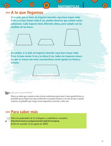 Para saber más Sobre las propiedades de los triángulos y cuadriláteros consulten: http://matematicas.net/paraiso/cabri.php?id=trianprop [Fecha de consulta: 23 de agosto de 2007].
