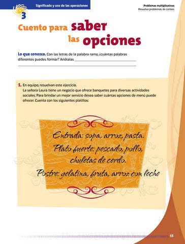 1. En equipo, resuelvan este ejercicio. La señora Laura tiene un negocio que ofrece banquetes para diversas actividades sociales. Para brindar un mejor servicio desea saber cuántas opciones de menú puede ofrecer. Cuenta con los siguientes platillos: