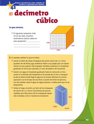 vacíen el contenido del recipiente en el envase de un litro y marquen la altura hasta donde llegó el agua en el envase. Efectúen la misma operación con el envase de dos litros. Cuando terminen el ejercicio, uno de ustedes vacíe el agua en alguna planta o cubeta para que no se desperdicie. ❖ Midan el largo, el ancho y el alto de los empaques