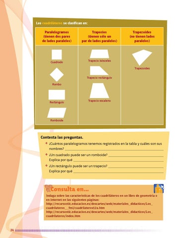 Indaga sobre las características de los cuadriláteros en un libro de geometría o en internet en las siguientes páginas: http://recursostic.educacion.es/descartes/web/materiales_didacticos/Los_ cuadrilateros__fmi/cuadrilateros12a.htm http://recursostic.educacion.es/descartes/web/materiales_didacticos/Los_ cuadrilateros/index.htm