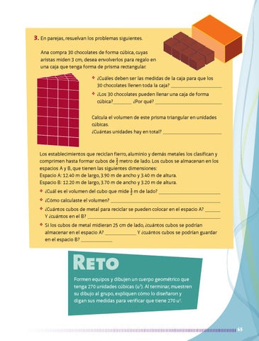 3. En parejas, resuelvan los problemas siguientes. Ana compra 30 chocolates de forma cúbica, cuyas aristas miden 3 cm; desea envolverlos para regalo en una caja que tenga forma de prisma rectangular. ❖ ¿Cuáles deben ser las medidas de la caja para que los