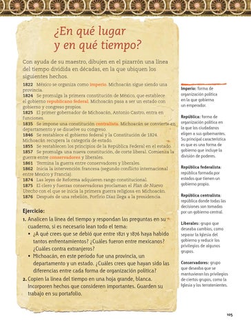 ¿En qué lugar y en qué tiempo? Con ayuda de su maestro, dibujen en el pizarrón una línea del tiempo dividida en décadas, en la que ubiquen los siguientes hechos. 1822 México se organiza como imperio. Michoacán sigue siendo una provincia. 1824 Se promulga la primera constitución de México, que establece el gobierno republicano federal. Michoacán pasa a ser un estado con gobierno y congreso propios. 1825 El primer gobernador de Michoacán, Antonio Castro, entra en funciones. 1835 Se impone una constitución centralista. Michoacán se convierte en departamento y se disuelve su congreso. 1846 Se restablece el gobierno federal y la Constitución de 1824. Michoacán recupera la categoría de estado. 1855 Se restablecen los principios de la República Federal en el estado. 1857 Se promulga una nueva constitución, de corte liberal. Comienza la guerra entre conservadores y liberales. 1861 Termina la guerra entre conservadores y liberales. 1862 Inicia la intervención francesa (segundo conflicto internacional entre Mexico y Francia). 1874 Las leyes de Reforma adquieren rango constitucional. 1875 El clero y fuerzas conservadoras proclaman el Plan de Nuevo Urecho con el que se inicia la primera guerra religiosa en Michoacán. 1876 Después de una rebelión, Porfirio Díaz llega a la presidencia.