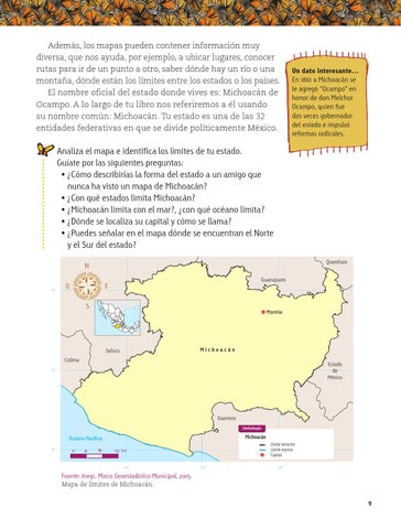 Además, los mapas pueden contener información muy diversa, que nos ayuda, por ejemplo, a ubicar lugares, conocer rutas para ir de un punto a otro, saber dónde hay un río o una montaña, dónde están los límites entre los estados o los países. El nombre oficial del estado donde vives es: Michoacán de Ocampo. A lo largo de tu libro nos referiremos a él usando su nombre común: Michoacán. Tu estado es una de las 32 entidades federativas en que se divide políticamente México.