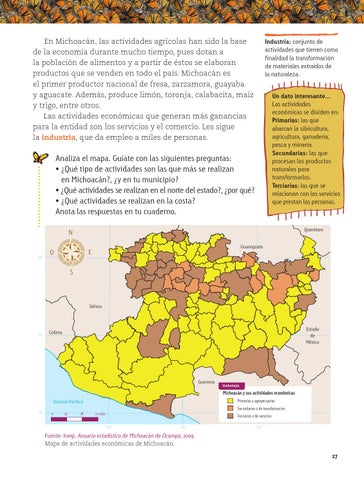 Analiza el mapa. Guíate con las siguientes preguntas: • ¿Qué tipo de actividades son las que más se realizan en Michoacán?, ¿y en tu municipio? • ¿Qué actividades se realizan en el norte del estado?, ¿por qué? • ¿Qué actividades se realizan en la costa? Anota las respuestas en tu cuaderno.
