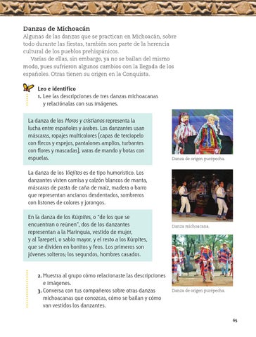 Leo e identifico 1. Lee las descripciones de tres danzas michoacanas y relaciónalas con sus imágenes. La danza de los Moros y cristianos representa la lucha entre españoles y árabes. Los danzantes usan máscaras, ropajes multicolores (capas de terciopelo con flecos y espejos, pantalones amplios, turbantes con flores y mascadas), varas de mando y botas con espuelas.