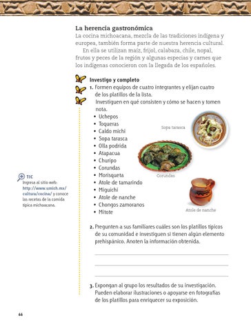 Investigo y completo 1. Formen equipos de cuatro integrantes y elijan cuatro de los platillos de la lista. Investiguen en qué consisten y cómo se hacen y tomen nota. • Uchepos • Toqueras Sopa tarasca • Caldo michi • Sopa tarasca • Olla podrida • Atapacua • Churipo • Corundas Corundas • Morisqueta • Atole de tamarindo • Miguichi • Atole de nanche • Chongos zamoranos Atole de nanche • Mitote 2. Pregunten a sus familiares cuáles son los platillos típicos de su comunidad e investiguen si tienen algún elemento prehispánico. Anoten la información obtenida. 3. Expongan al grupo los resultados de su investigación. Pueden elaborar ilustraciones o apoyarse en fotografías de los platillos para enriquecer su exposición.