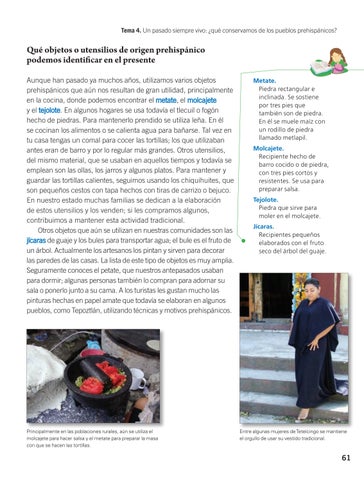 Qué objetos o utensilios de origen prehispánico podemos identificar en el presente Aunque han pasado ya muchos años, utilizamos varios objetos prehispánicos que aún nos resultan de gran utilidad, principalmente en la cocina, donde podemos encontrar el metate, el molcajete y el tejolote. En algunos hogares se usa todavía el tlecuil o fogón hecho de piedras. Para mantenerlo prendido se utiliza leña. En él se cocinan los alimentos o se calienta agua para bañarse. Tal vez en tu casa tengas un comal para cocer las tortillas; los que utilizaban antes eran de barro y por lo regular más grandes. Otros utensilios, del mismo material, que se usaban en aquellos tiempos y todavía se emplean son las ollas, los jarros y algunos platos. Para mantener y guardar las tortillas calientes, seguimos usando los chiquihuites, que son pequeños cestos con tapa hechos con tiras de carrizo o bejuco. En nuestro estado muchas familias se dedican a la elaboración de estos utensilios y los venden; si les compramos algunos, contribuimos a mantener esta actividad tradicional. Otros objetos que aún se utilizan en nuestras comunidades son las jícaras de guaje y los bules para transportar agua; el bule es el fruto de un árbol. Actualmente los artesanos los pintan y sirven para decorar las paredes de las casas. La lista de este tipo de objetos es muy amplia. Seguramente conoces el petate, que nuestros antepasados usaban para dormir; algunas personas también lo compran para adornar su sala o ponerlo junto a su cama. A los turistas les gustan mucho las pinturas hechas en papel amate que todavía se elaboran en algunos pueblos, como Tepoztlán, utilizando técnicas y motivos prehispánicos.