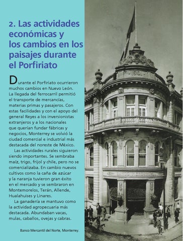 urante el Porfiriato ocurrieron muchos cambios en Nuevo León. La llegada del ferrocarril permitió el transporte de mercancías, materias primas y pasajeros. Con estas facilidades y con el apoyo del general Reyes a los inversionistas extranjeros y a los nacionales que querían fundar fábricas y negocios, Monterrey se volvió la ciudad comercial e industrial más destacada del noreste de México. Las actividades rurales siguieron siendo importantes. Se sembraba maíz, trigo, frijol y chile, pero no se comercializaba. En cambio nuevos cultivos como la caña de azúcar y la naranja tuvieron gran éxito en el mercado y se sembraron en Montemorelos, Terán, Allende, Hualahuises y Linares. La ganadería se mantuvo como la actividad agropecuaria más destacada. Abundaban vacas, mulas, caballos, ovejas y cabras. Banco Mercantil del Norte, Monterrey.