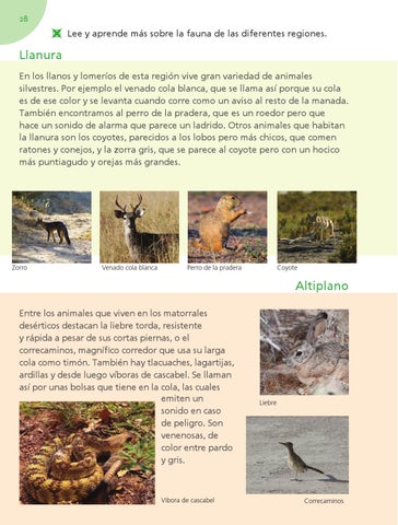 Llanura En los llanos y lomeríos de esta región vive gran variedad de animales silvestres. Por ejemplo el venado cola blanca, que se llama así porque su cola es de ese color y se levanta cuando corre como un aviso al resto de la manada. También encontramos al perro de la pradera, que es un roedor pero que hace un sonido de alarma que parece un ladrido. Otros animales que habitan la llanura son los coyotes, parecidos a los lobos pero más chicos, que comen ratones y conejos, y la zorra gris, que se parece al coyote pero con un hocico más puntiagudo y orejas más grandes.