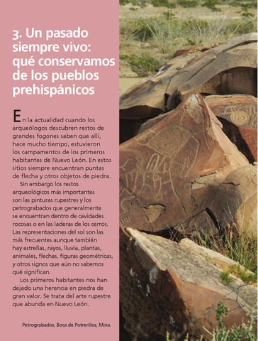 n la actualidad cuando los arqueólogos descubren restos de grandes fogones saben que allí, hace mucho tiempo, estuvieron los campamentos de los primeros habitantes de Nuevo León. En estos sitios siempre encuentran puntas de flecha y otros objetos de piedra. Sin embargo los restos arqueológicos más importantes son las pinturas rupestres y los petrograbados que generalmente se encuentran dentro de cavidades rocosas o en las laderas de los cerros. Las representaciones del sol son las más frecuentes aunque también hay estrellas, rayos, lluvia, plantas, animales, flechas, figuras geométricas, y otros signos que aún no sabemos qué significan. Los primeros habitantes nos han dejado una herencia en piedra de gran valor. Se trata del arte rupestre que abunda en Nuevo León.