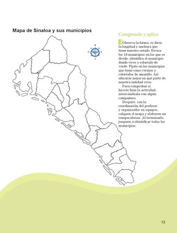 Comprendo y aplico Observa la forma, es decir, la longitud y anchura que tiene nuestro estado. Revisa los 18 municipios en los que se divide, identifica el municipio donde vives y coloréalo de verde. Fíjate en los municipios que tiene como vecinos y coloréalos de amarillo. Así ubicarás mejor en qué parte de nuestra entidad vives. Para comprobar si hiciste bien la actividad, intercámbiala con algún compañero. Después, con la coordinación del profesor y organizados en equipos, calquen el mapa y elaboren un rompecabezas. Al terminarlo, jueguen a identificar todos los municipios.