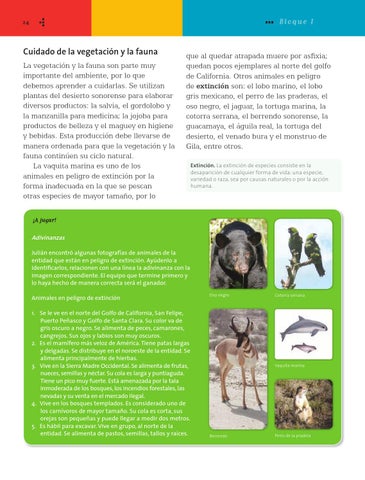 ¡A jugar! Adivinanzas Julián encontró algunas fotografías de animales de la entidad que están en peligro de extinción. Ayúdenlo a identificarlos, relacionen con una línea la adivinanza con la imagen correspondiente. El equipo que termine primero y lo haya hecho de manera correcta será el ganador. Animales en peligro de extinción 1. Se le ve en el norte del Golfo de California, San Felipe, Puerto Peñasco y Golfo de Santa Clara. Su color va de gris oscuro a negro. Se alimenta de peces, camarones, cangrejos. Sus ojos y labios son muy oscuros. 2. Es el mamífero más veloz de América. Tiene patas largas y delgadas. Se distribuye en el noroeste de la entidad. Se alimenta principalmente de hierbas. 3. Vive en la Sierra Madre Occidental. Se alimenta de frutas, nueces, semillas y néctar. Su cola es larga y puntiaguda. Tiene un pico muy fuerte. Está amenazada por la tala inmoderada de los bosques, los incendios forestales, las nevadas y su venta en el mercado ilegal. 4. Vive en los bosques templados. Es considerado uno de los carnívoros de mayor tamaño. Su cola es corta, sus orejas son pequeñas y puede llegar a medir dos metros. 5. Es hábil para excavar. Vive en grupo, al norte de la entidad. Se alimenta de pastos, semillas, tallos y raíces.
