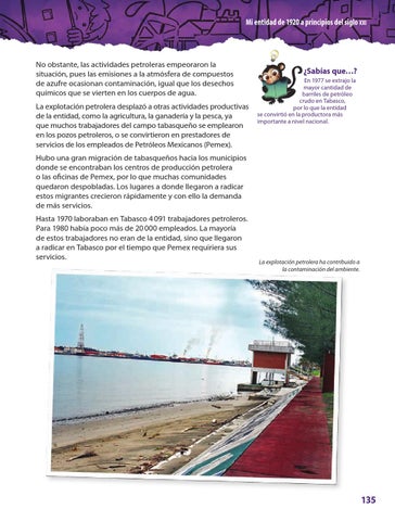 No obstante, las actividades petroleras empeoraron la situación, pues las emisiones a la atmósfera de compuestos de azufre ocasionan contaminación, igual que los desechos químicos que se vierten en los cuerpos de agua. La explotación petrolera desplazó a otras actividades productivas de la entidad, como la agricultura, la ganadería y la pesca, ya que muchos trabajadores del campo tabasqueño se emplearon en los pozos petroleros, o se convirtieron en prestadores de servicios de los empleados de Petróleos Mexicanos (Pemex).