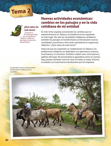 Nuevas actividades económicas: cambios en los paisajes y en la vida cotidiana de mi entidad En este tema seguirás conociendo los cambios que se experimentaron en Tabasco al establecerse los españoles en este lugar. No sólo las sociedades indígenas cambiaron, también los paisajes se transformaron al introducirse nuevas actividades económicas. Pero antes atendamos la sugerencia didáctica “¿Qué sabes de este tema?” Antes de que los españoles se establecieran en Tabasco, las poblaciones indígenas se dedicaban a la agricultura, la pesca, la artesanía y el comercio. También criaban aves como pavos y gallinas del lugar. No practicaban la ganadería como se conoce hoy, porque animales como la vaca, el cerdo, la oveja, el burro, el caballo y la mula fueron introducidos por los hispanos.