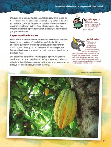Actividades Visita con tu maestro y compañeros de grupo una plantación de cacao, para que conozcan su producción. Dibujen cada una de sus etapas: siembra, cosecha y limpieza del grano. Expliquen por qué creen que esta actividad económica siguió siendo importante en la época virreinal y escriban sus conclusiones.