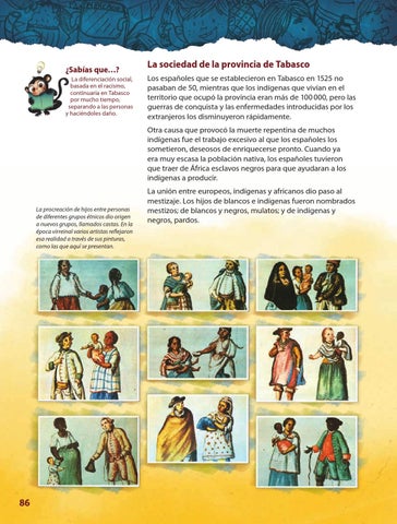 La sociedad de la provincia de Tabasco Los españoles que se establecieron en Tabasco en 1525 no pasaban de 50, mientras que los indígenas que vivían en el territorio que ocupó la provincia eran más de 100 000, pero las guerras de conquista y las enfermedades introducidas por los extranjeros los disminuyeron rápidamente. Otra causa que provocó la muerte repentina de muchos indígenas fue el trabajo excesivo al que los españoles los sometieron, deseosos de enriquecerse pronto. Cuando ya era muy escasa la población nativa, los españoles tuvieron que traer de África esclavos negros para que ayudaran a los indígenas a producir.