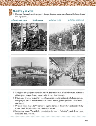 2. Averigüen en qué poblaciones de Veracruz se efectuaban estas actividades. Para esto, pidan ayuda a su profesor y visiten la biblioteca de su escuela. 3. Dibujen un símbolo pequeño y sencillo para representar cada actividad económica. Por ejemplo, para la industria textil un carrete de hilo, para la petrolera un barril de petróleo… 4. Ubiquen en un mapa de Veracruz los lugares donde se desarrollaba cada actividad y tracen sobre éstos los símbolos correspondientes. 5. Llamen este mapa: “Actividades económicas durante el Porfiriato”, y guárdenlo en su Portafolio de evidencias. 105
