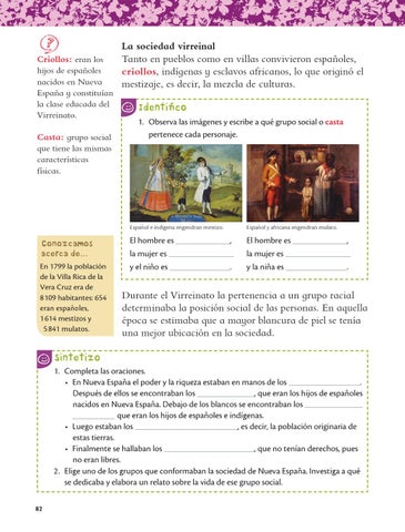Sintetizo 1. Completa las oraciones. • En Nueva España el poder y la riqueza estaban en manos de los . , que eran los hijos de españoles Después de ellos se encontraban los nacidos en Nueva España. Debajo de los blancos se encontraban los que eran los hijos de españoles e indígenas. , es decir, la población originaria de • Luego estaban los estas tierras. • Finalmente se hallaban los , que no tenían derechos, pues no eran libres. 2. Elige uno de los grupos que conformaban la sociedad de Nueva España. Investiga a qué se dedicaba y elabora un relato sobre la vida de ese grupo social. 82